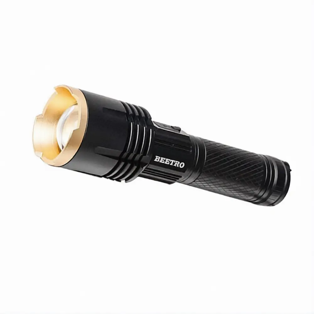 Lampe torche Beetro LA281 avec puissance lumineuse P50 LED 10 W, 5 modes d’éclairage (100 %, 75 %, 50 %, flash, SOS), batterie rechargeable intégrée via port USB, construction en alliage d’aluminium durable et zoom télescopique réglable pour un éclairage adaptable selon les besoins.