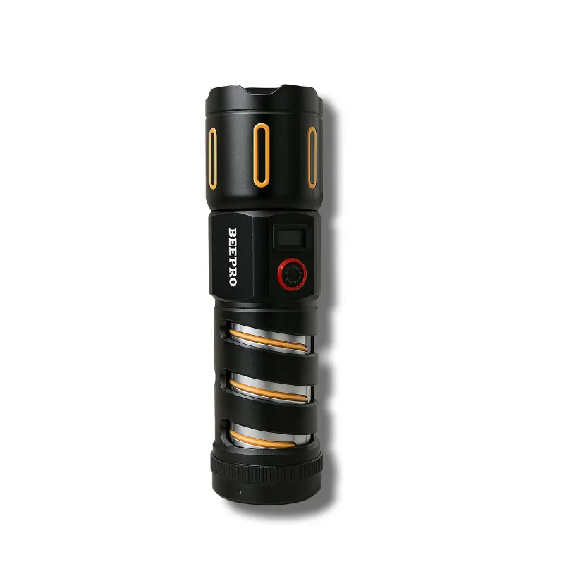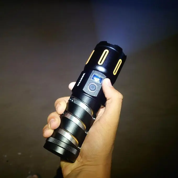 Lampe torche Beetro LA518 avec LED ultra-puissante à faisceau concentré, batterie lithium 18650 rechargeable, port de charge USB Type-C rapide, fonction power bank pour recharger un téléphone et indicateur de charge intégré — lampe portable fiable pour camping, urgence et usages quotidiens.