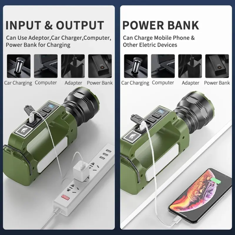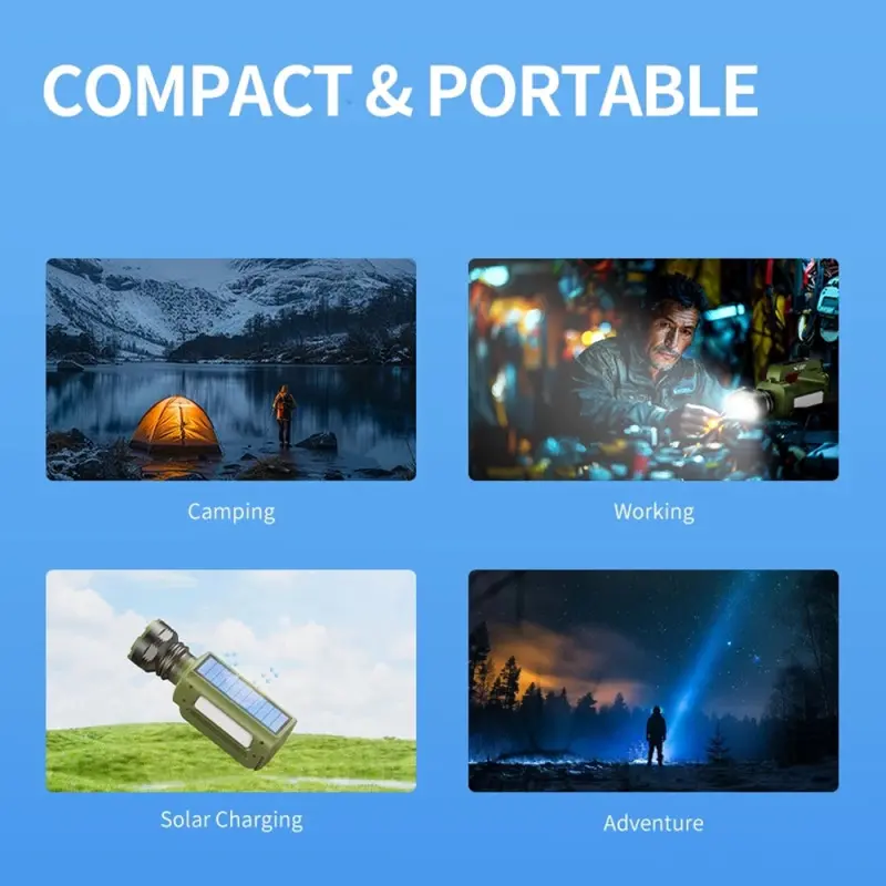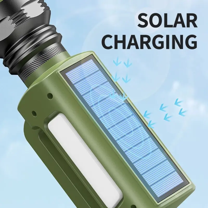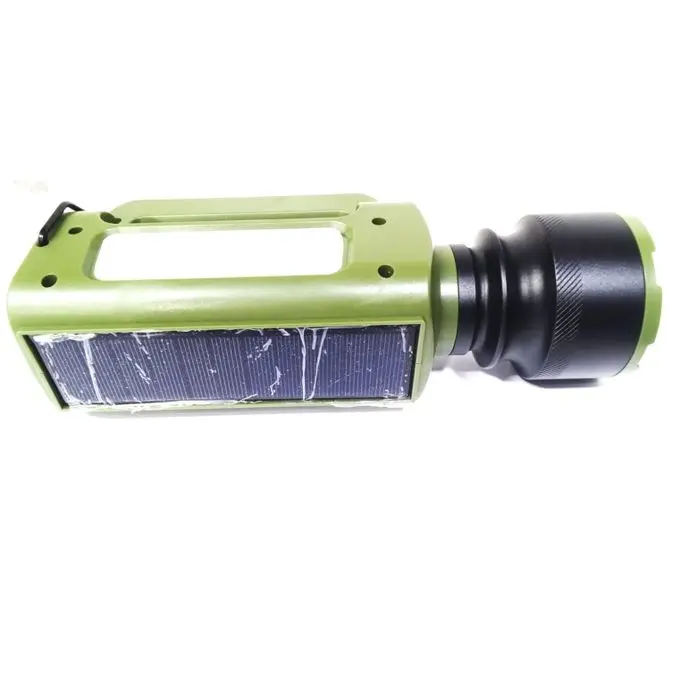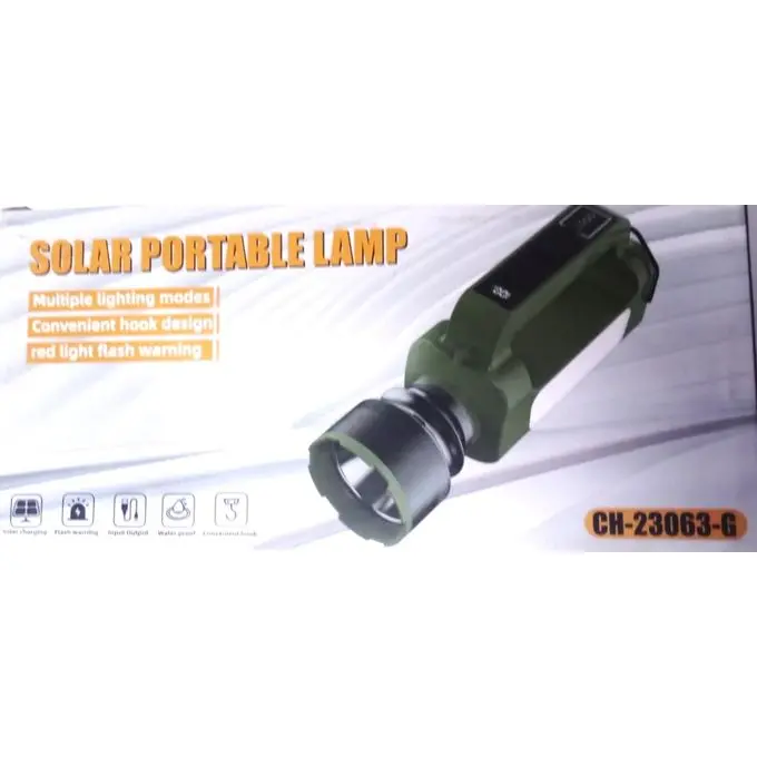Lampe torche LED solaire puissante modèle CH-23063-S, conçue pour l’éclairage d’urgence, le camping et l’usage domestique. Équipée d’une batterie rechargeable haute capacité, de plusieurs modes d’éclairage et d’un double système de recharge solaire + USB.