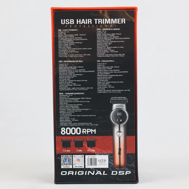 La tondeuse DSP 91418 est un appareil professionnel sans fil, équipé d’un moteur haute vitesse, lame en acier inoxydable / revêtement céramique, batterie lithium-ion (~1200 mAh) offrant une autonomie prolongée et un code moteur FF280PE. Caractéristiques techniques importantes : puissance 5 W, batterie 18650, affichage LED.