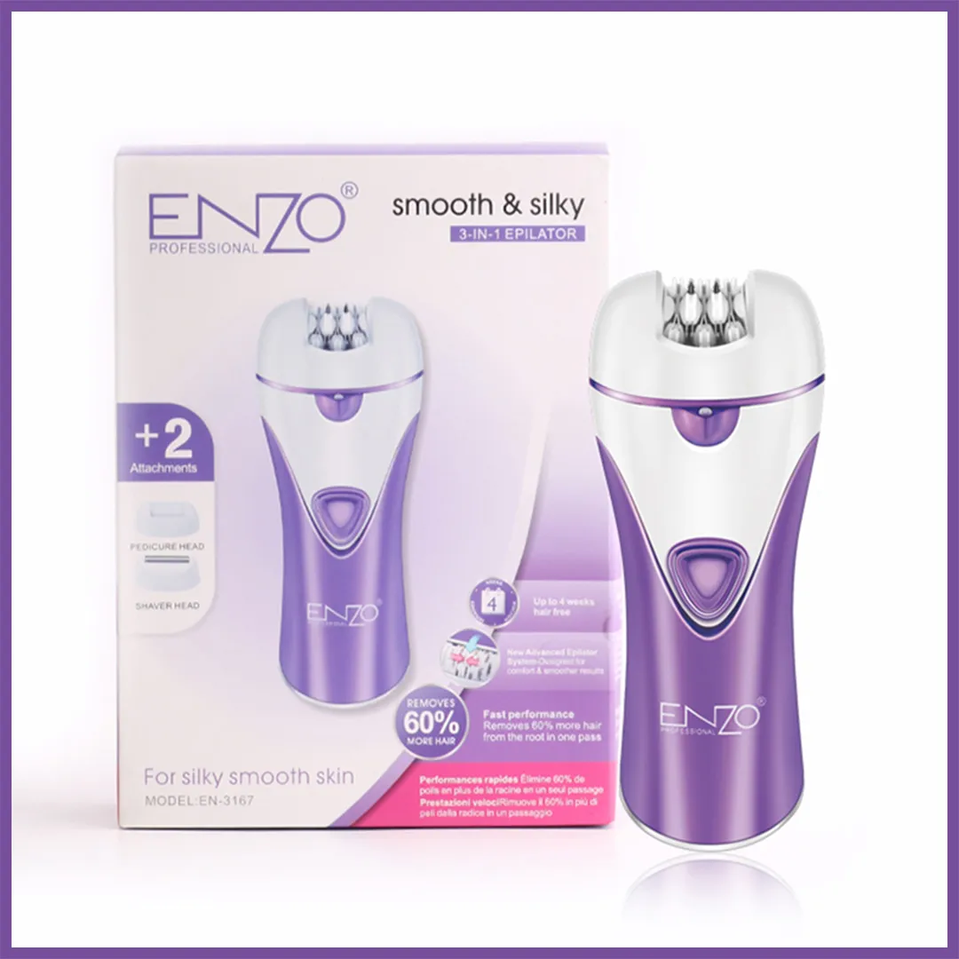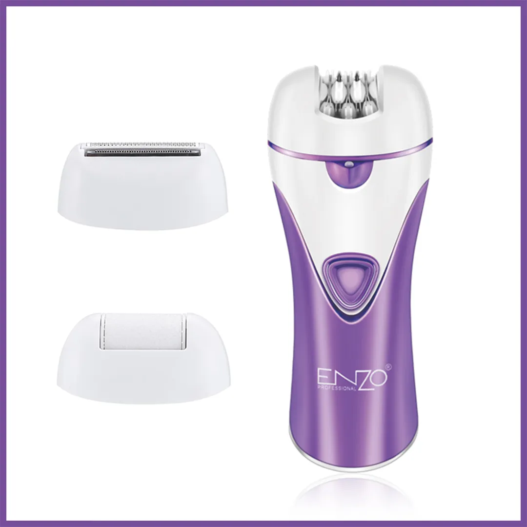 L’appareil d’épilation 3 en 1 Enzo Enzo EN-3167 combine rasoir, épilateur et lime à pied électrique dans un seul outil pratique, offrant une épilation efficace, un soin des pieds et un rasage doux avec une batterie rechargeable longue durée.