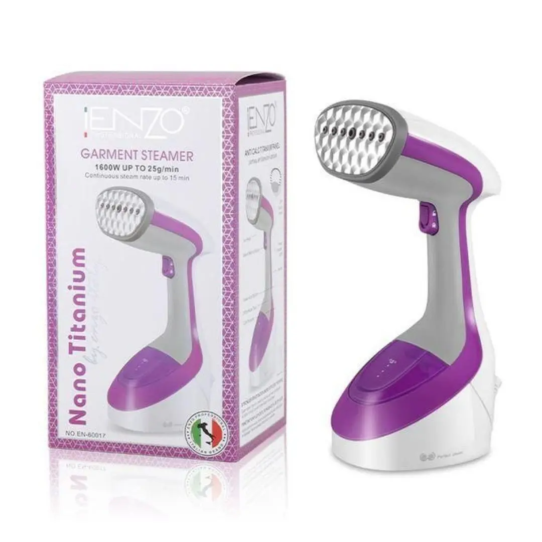 Défroisseur ENZO Nano Titanium EN-60017 avec technologie Nano Titanium, puissance 1600 W, réservoir d’eau 300 ml, vapeur continue jusqu’à 30 g/min, chauffe rapide en ~45 s, fonction anti-calcaire / anti-goutte, tête pivotante et accessoires inclus — conçu pour repasser et rafraîchir tous types de vêtements facilement à domicile.