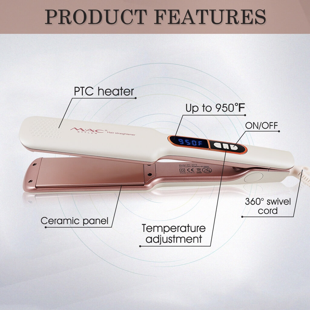 MAC MC-3073 Styler Fer à lisser professionnel pour cheveux Fer à lisser Mac Chauffage très rapide jusqu’à 450°F – 900°F Tension : 110-240V. Puissance : 45 W-250 W