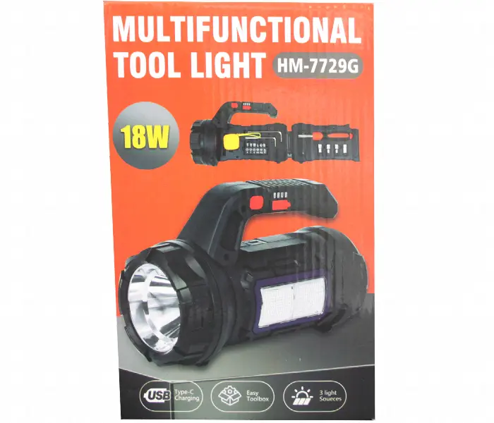 Lampe torche HM-7729G multifonction avec éclairage LED principal et COB latéral, puissance moyenne ~18 W, batterie rechargeable 2400 mAh, indicateur de charge LED, USB-C pour recharge rapide et boîte à outils intégrée pour interventions rapides, bricolage et dépannage.