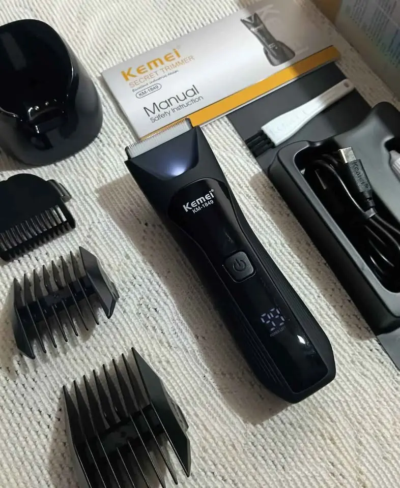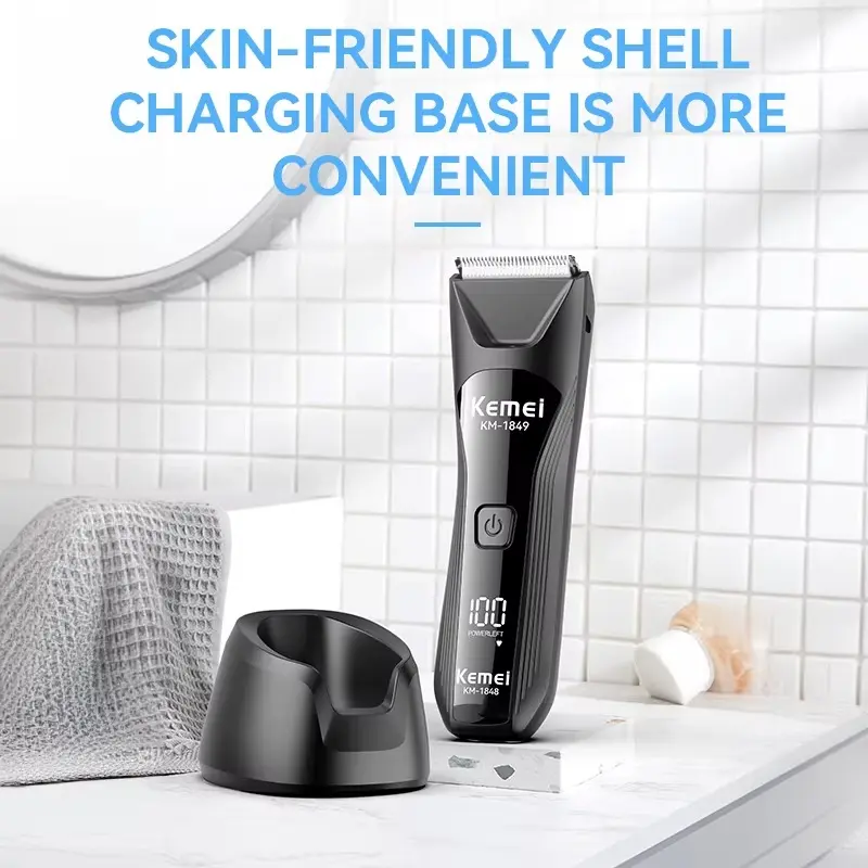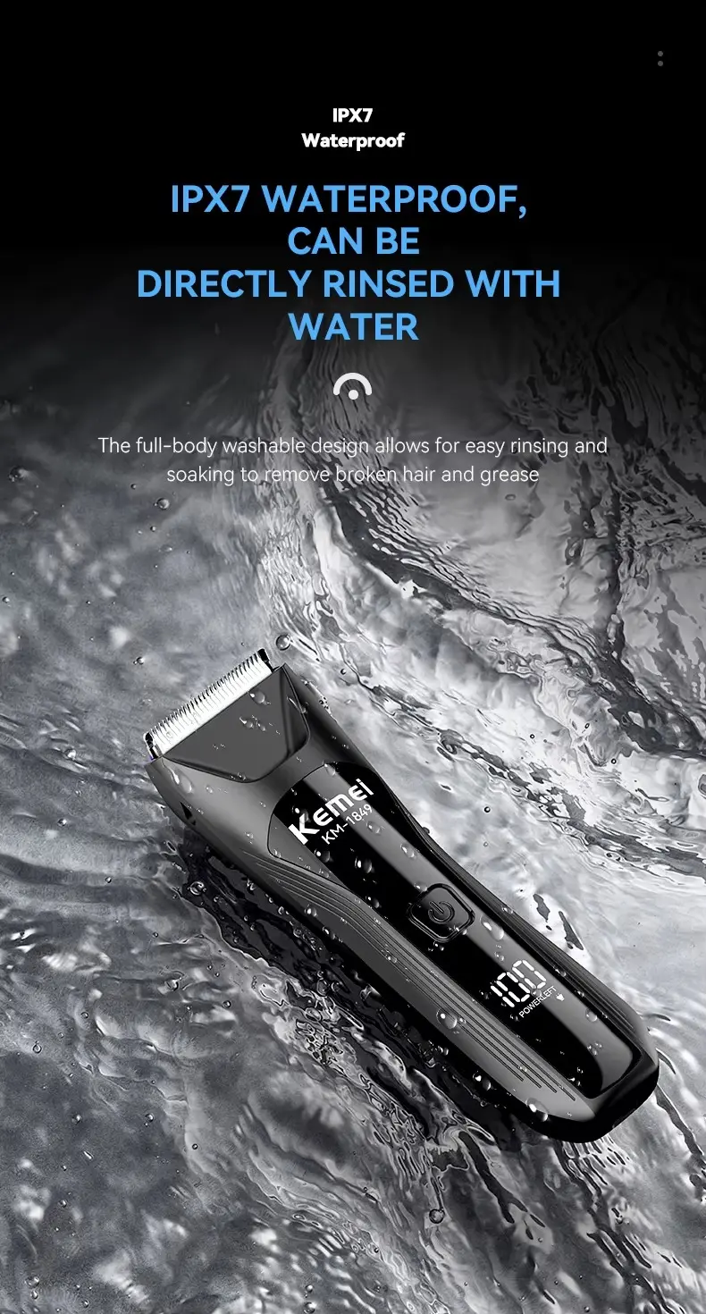 Tondeuse électrique rechargeable Kemei KM‑1849 avec batterie 600 mAh, puissance 5 W, autonomie jusqu’à 90 min, étanchéité IPX7, lames sûres pour la peau et écran LED/LCD : idéale pour la coupe des poils du corps, de la barbe et des zones sensibles.