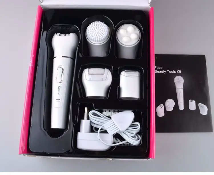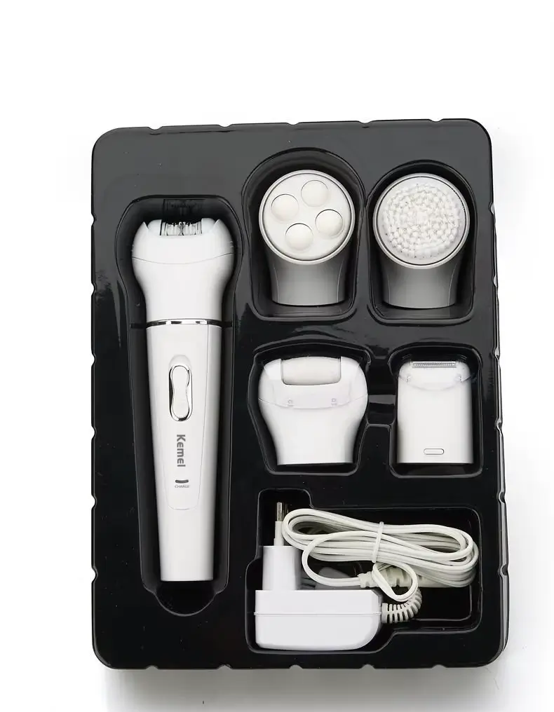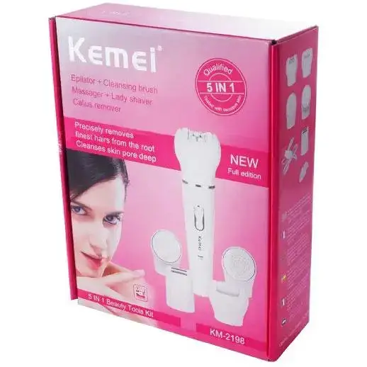 Appareil multifonction Kemei KM-2198 5-en-1 — épilateur, rasoir, tondeuse, brosse nettoyante et accessoire callosités — avec batterie rechargeable (capacité environ 450 mAh), utilisation sans fil, alimentation USB / 5 V, idéal pour épilation corps, visage, jambes, aisselles, maillot.