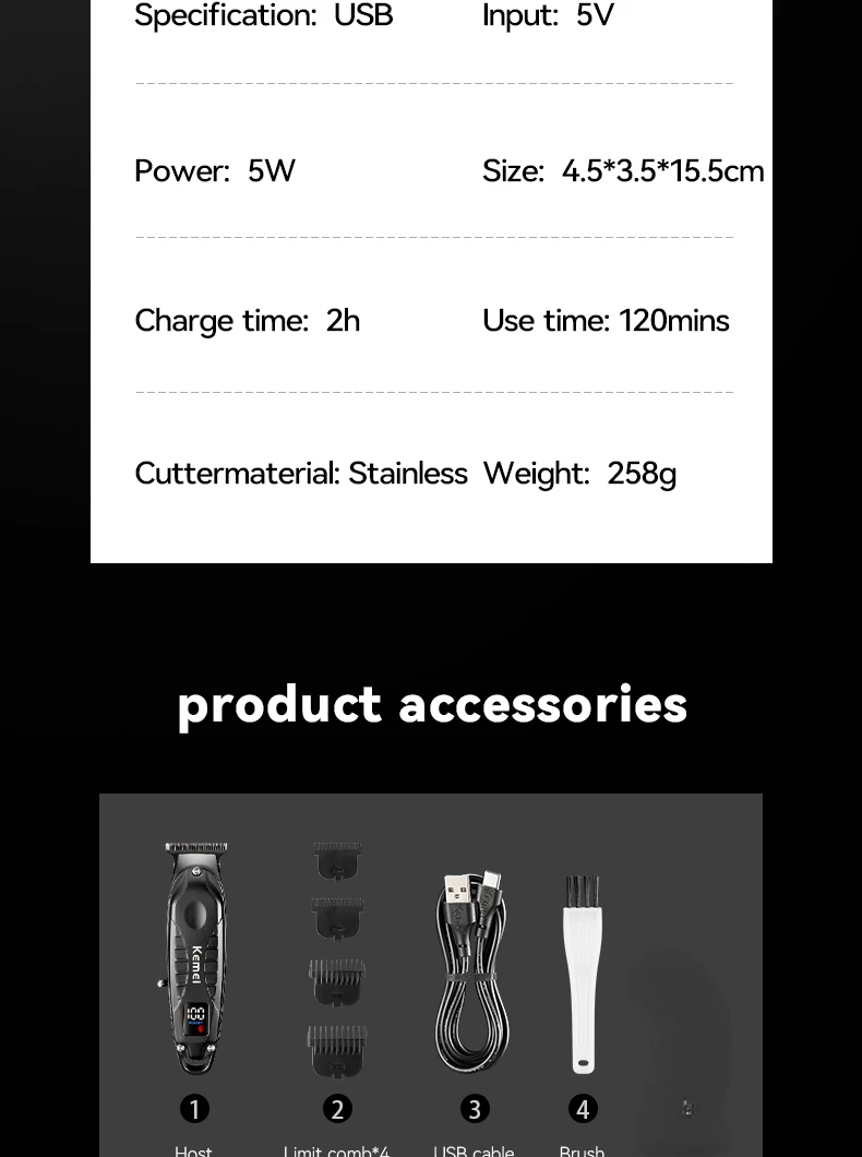 Kemei KM-2261 Tondeuse À Cheveux USB Rechargeable Sans Fil Barbe gris avec affiheur