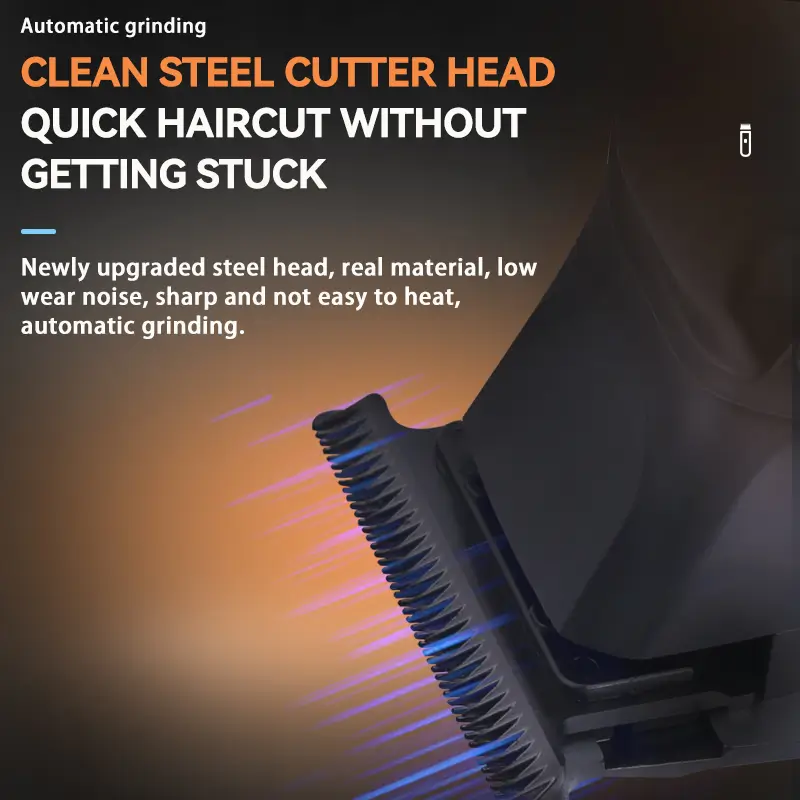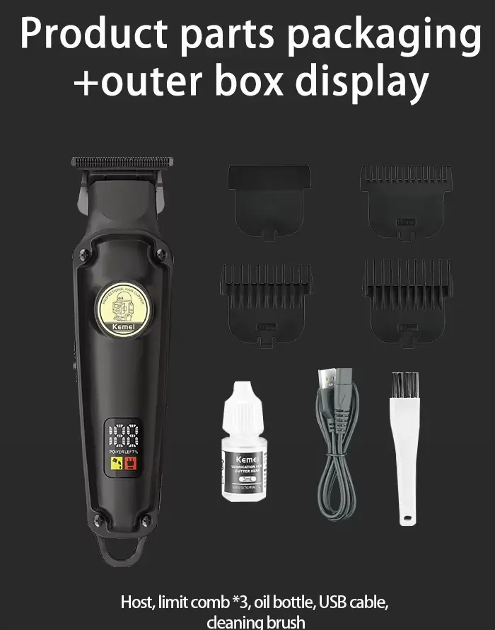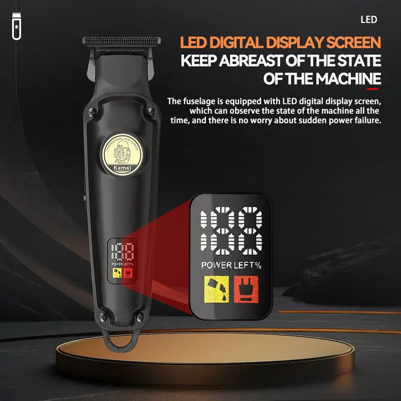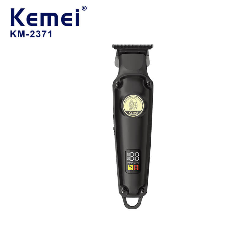 Tondeuse Kemei KM-2371 équipée d’un moteur puissant de 7 000 tr/min, d’une batterie lithium-ion rechargeable offrant jusqu’à 240 minutes d’autonomie, et de lames en acier inoxydable haute précision. Écran LED intégré et recharge USB pratique.