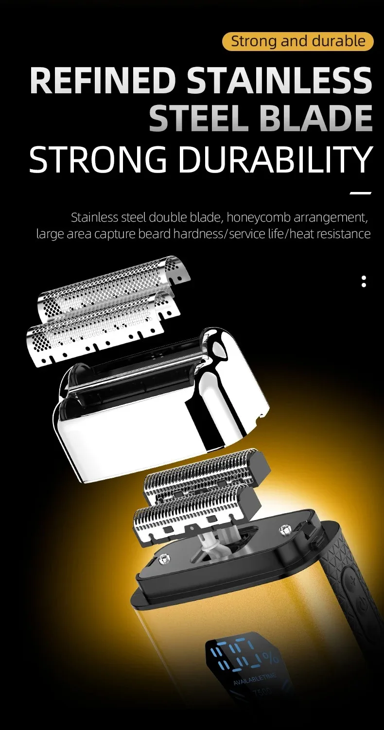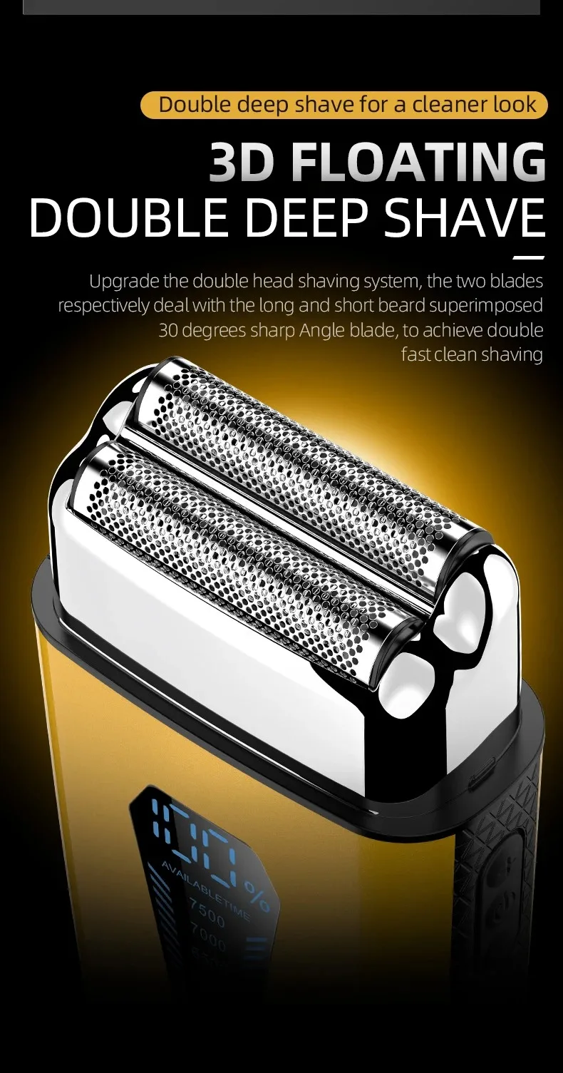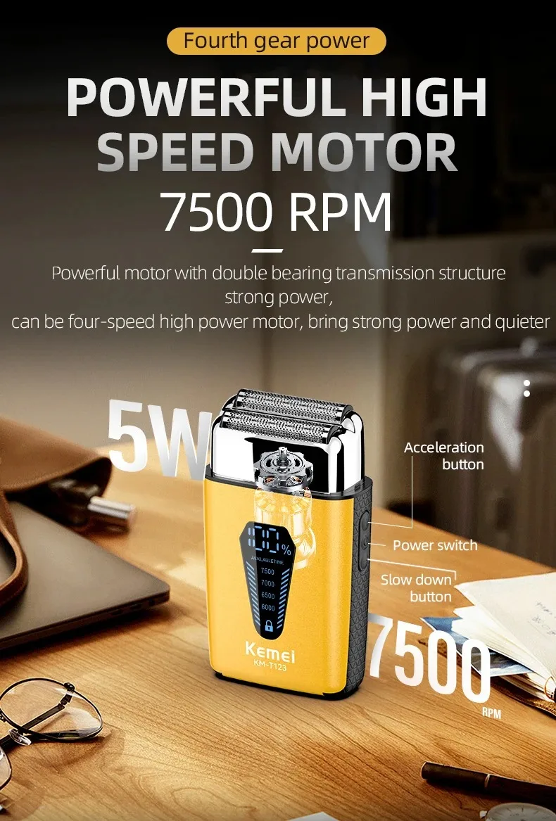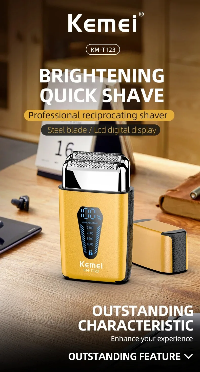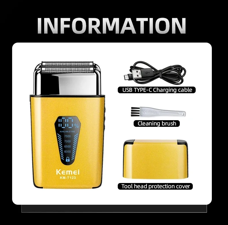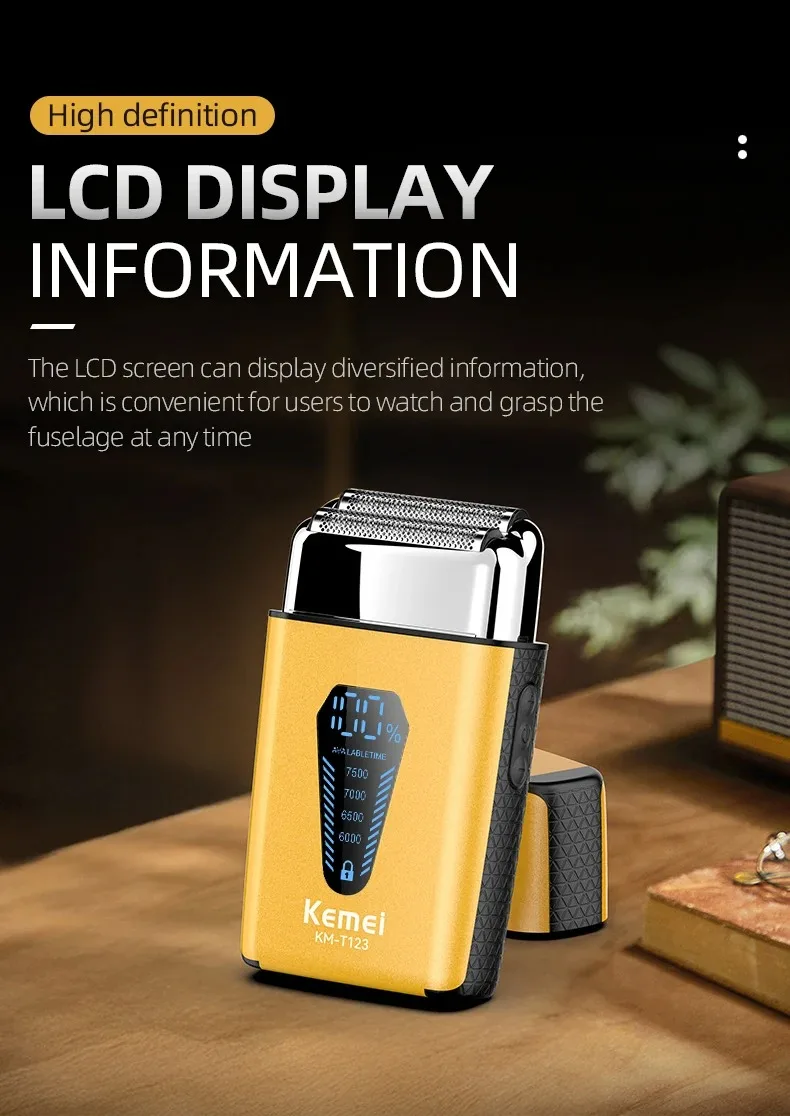 Kemei KM-T123 rasoir electrique hommes rasoir barbe à barbe 8500 tr/min doré LCD Rasoir pour hommes