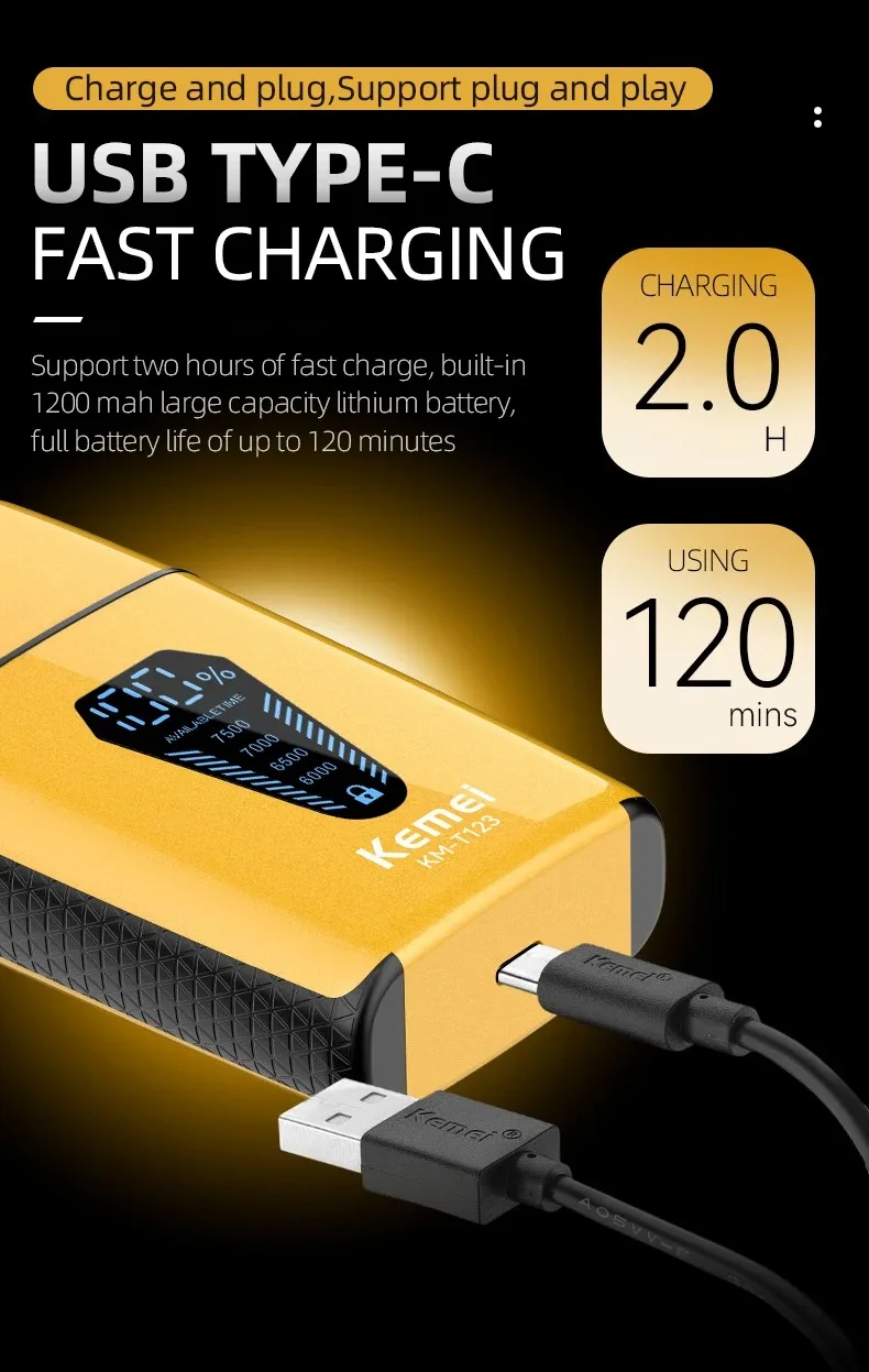 ★Vitesse du moteur 6000-7500 tr/min :Le rasoir KM-T123 est doté d’un puissant moteur de 6 000 à 7 500 tours par minute (RPM), permettant un rasage rapide et efficace.