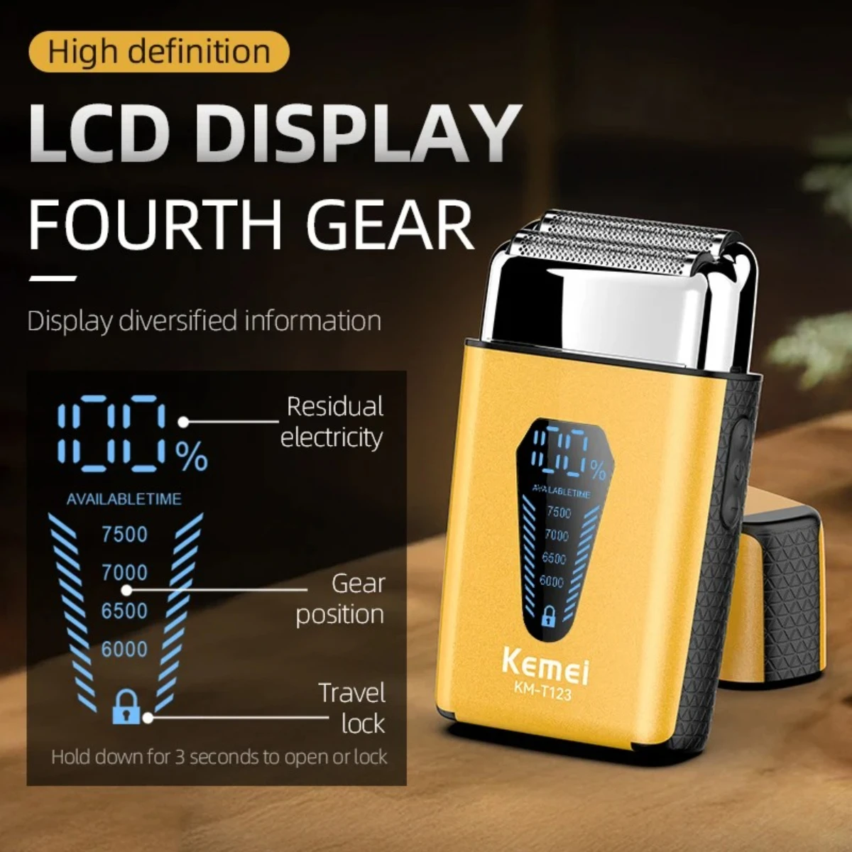 Kemei KM-T123 rasoir electrique hommes rasoir barbe à barbe 8500 tr/min doré LCD Rasoir pour hommes