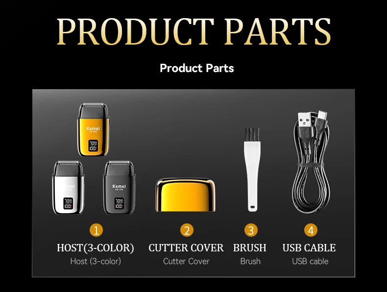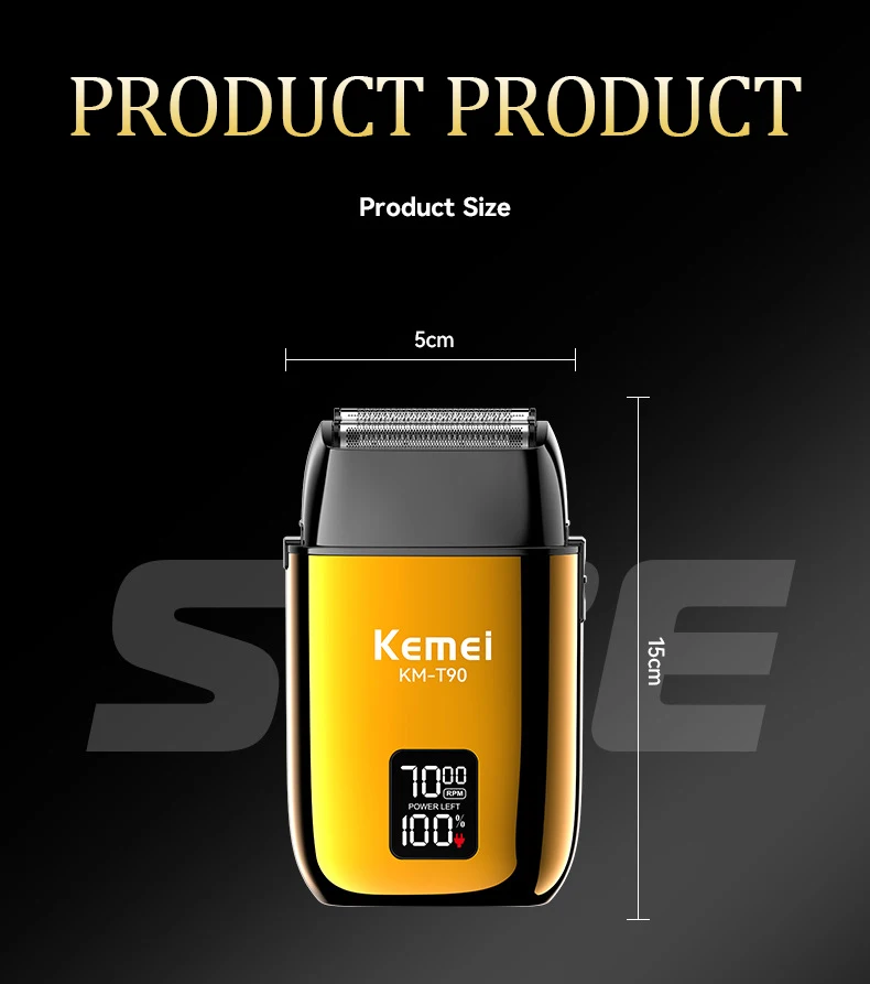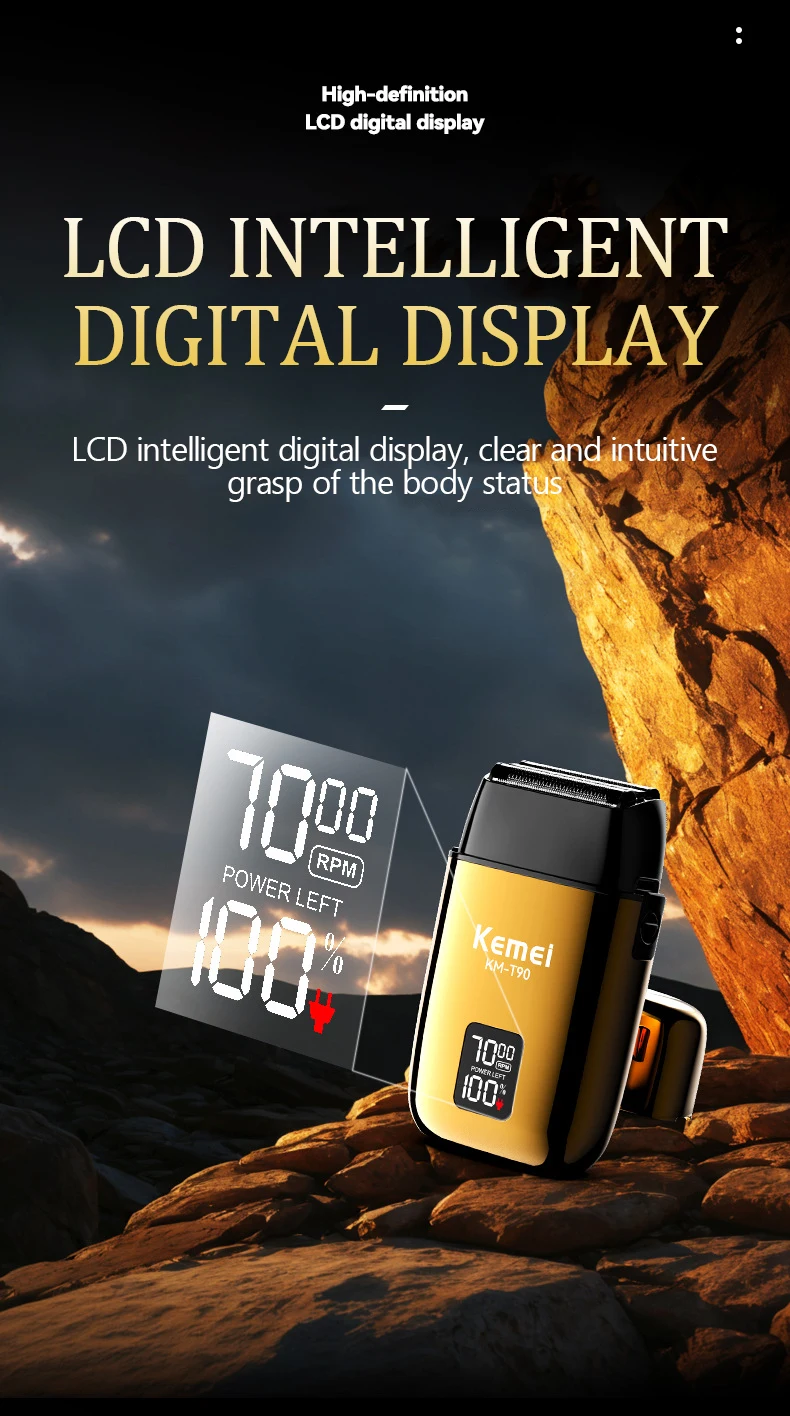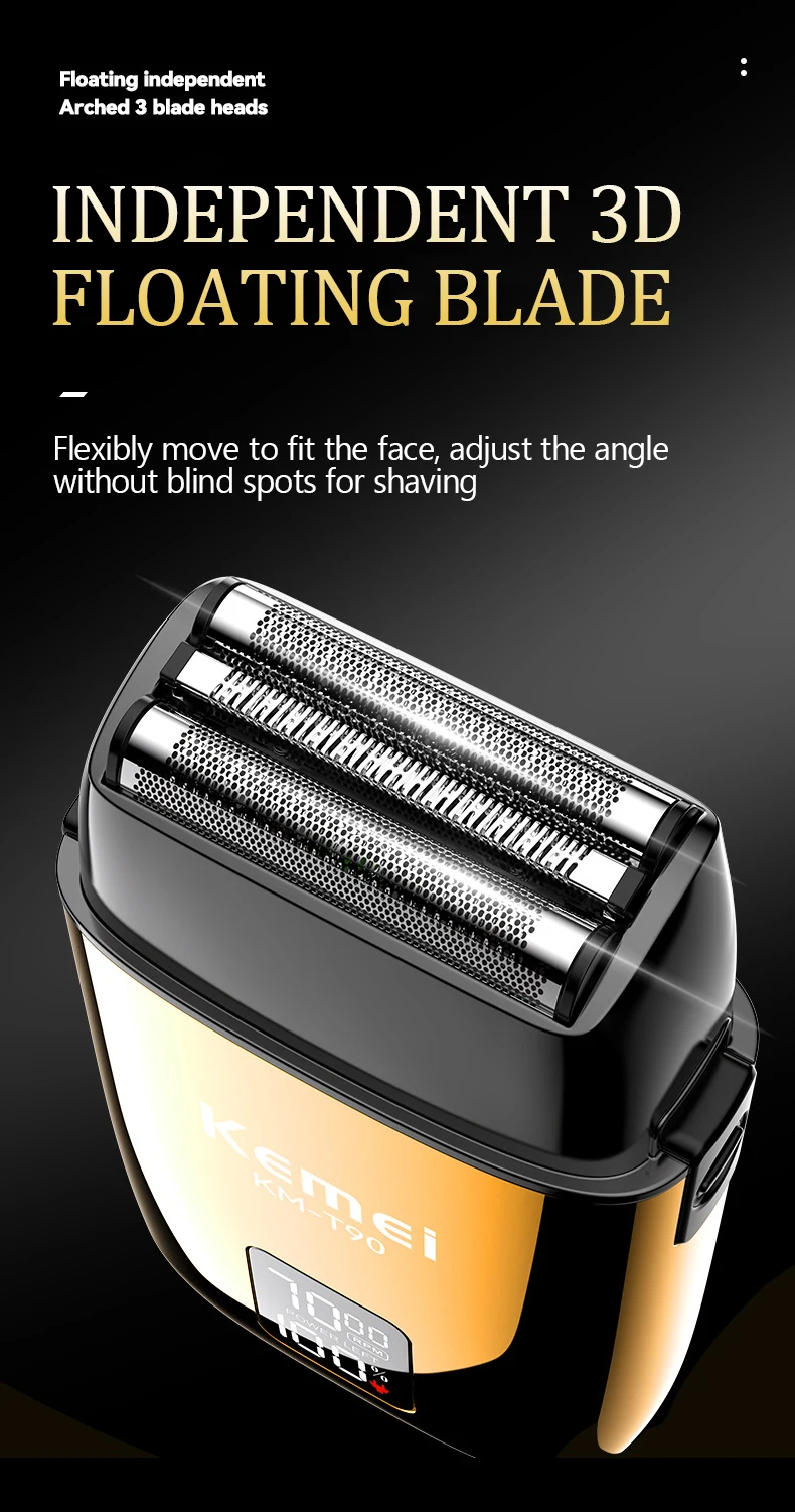 KEMEI KM-T90 rasoir électrique à 3 lames à tête flottante avec écran LCD et USB étanche gold doré