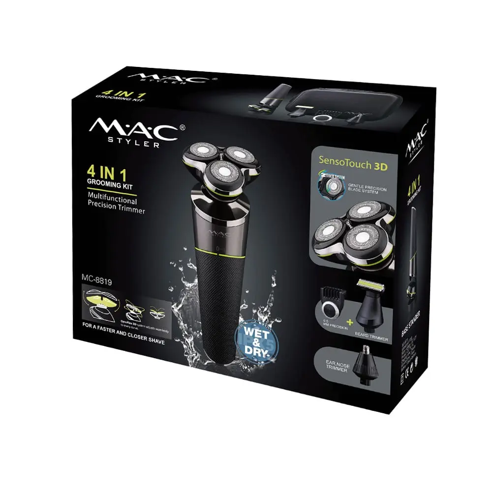 Rasoir électrique MAC MC-8819 conçu pour le rasage rapide et confortable de la barbe. Équipé de 4 têtes rotatives, d’un moteur DC 3.2 V, d’une batterie rechargeable offrant environ 60 minutes d’autonomie après 2 heures de charge. Utilisation rasage sec ou humide, protection IPX5 résistante à l’eau, design compact et ergonomique.