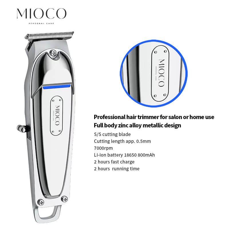 La MIOCO RS2116 est une tondeuse sans fil professionnelle avec lame en acier inoxydable, vitesse de coupe 7000 tr/min, design doré élégant, idéale pour cheveux, barbe et contours précis à la maison ou en salon.