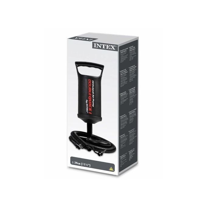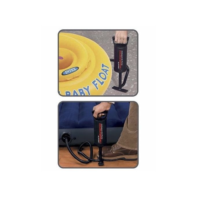 Facilité vous la vie et économisez votre souffle en vous achetons cette merveilleuse pompe à bouée de très bonne qualité de la marqué intex , elle est idéal pour gonfler ( vos bouée , les brassards de vos enfants , les gilets de sauvetage et même les ballons aquatiques ) notre pompe est d’une taille assez petite ce qui vous facilitera la tache , en effet vous elle est donc pas encombrante ce qui vous donnera l’opportunité de la transporter la ou vous voulez ( piscine , plage …) C’est un Gonfleur double action de 2 litres qui Gonfle dans les deux sens : pression et dépression.Ce gonfleur double action à main permet un gonflage rapide et efficace.Gonfleur idéal pour vos loisirs aquatiques (jeu d’eau…) ou tout autre type d’objets à gonfler.Informations techniques:Gonfleur composé d’un tuyau flexible avec 3 embouts adaptables à tout type de valve.