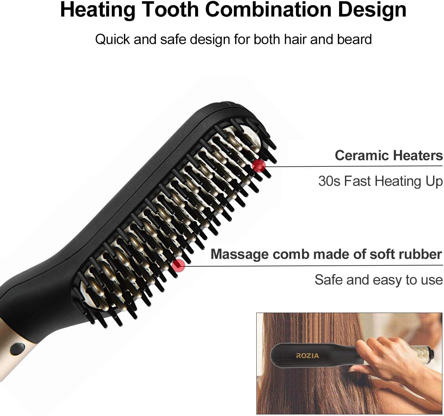 - [Technologie de chauffage rapide et sûre] : ce peigne lisseur de barbe est équipé de 34 dents chauffantes en métal-céramique (MCH) avancées. La température augmente en 3 secondes et la température monte à 200 degrés Celsius en 30 secondes. Les dents isolées sont réparties uniformément près des dents chauffantes pour protéger votre cuir chevelu des brûlures.