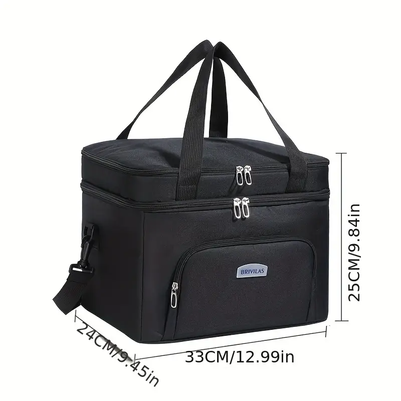 Le sac à lunch Brivilas double couche a été conçu pour allier esthétique moderne, robustesse et efficacité thermique. Confectionné à partir de tissu Oxford de haute qualité et doublé d’un matériau intérieur imperméable, il résiste aussi bien à l’humidité qu’aux rayures. Sa structure compacte (24 x 33 L x 25 H cm) lui permet de s’adapter facilement à tous les espaces, tout en offrant une capacité suffisante pour transporter un repas complet.