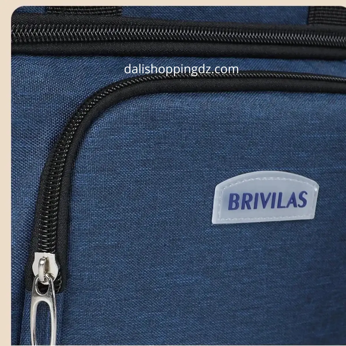 Nom du produit : Sac à lunch Brivilas Type : Sac isotherme double couche Matériaux : Extérieur en tissu Oxford, intérieur en couche imperméable Isolation : Jusqu’à 12 heures de fraîcheur Dimensions : (24 x 33 L x 25 H cm) Couleur : Bleu noir rose gris Compartiments : Double couche séparée Capacité : Jusqu’à 6 biberons de 9 oz ou équivalent Fonction spéciale : Compartiment pour bloc de glace intégré Poids : Léger (non précisé) Mode de port : à la main, à l’épaule, ou en sac à dos Utilisation : Sorties, école, travail, pique-nique, randonnée
