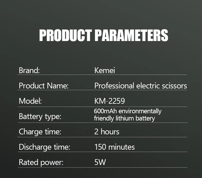 kemei km-2259 Type de moteur: Vibrant Temps De Charge De la batterie: Jusqu’à 2 heures Matériau de la lame: Acier inoxydable Autonomie de la batterie: Plus de 90 minutes